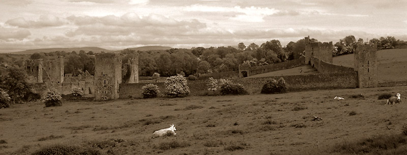 Kells Priory is one of the largest and also one of the most magnificent medieval historic monuments in Ireland. It is a National Monument and is in the guardianship of the Commissioners of Public Works. The priory is scenically situated alongside King's River, about fifteen kilometres south of the medieval city of Kilkenny (Fig 1c). Its most striking feature is a collection of medieval tower houses spaced at intervals along and within walls which enclose a site of just over three acres (Fig 8). These give the priory the appearance more of a fortress than of a place of worship and from them comes its local name of "Seven Castles". | The priory is divided into two parts, an inner monastic Precinct alongside the river and a large outer enclosure to the south. The fifteenth century the latter was referred to as Villa Prioris but in more recent times it has been known as Burgher's Court, the Burgess or Burgess Court. Burgess Court is adopted here because it best reflects the purpose for which it was constructed. In the past Burgess Court was though to have been the site of the medieval borough of Kell but modern reseach has shown that this was not the case. Today all the monastic remains are grouped together in the Precinct while Burgess Court is little more than a walled field populated by tourists and sheep. (c) Daniel Tietzsch-Tyler | |||||